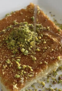 Shredded Phyllo Dough with walnuts with Rose Water Syrup and Ashta Cream